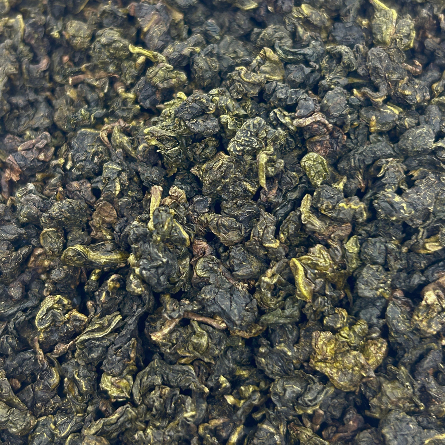 Apparence : Des feuilles de thé oolong roulées, avec une teinte verte et foncée.