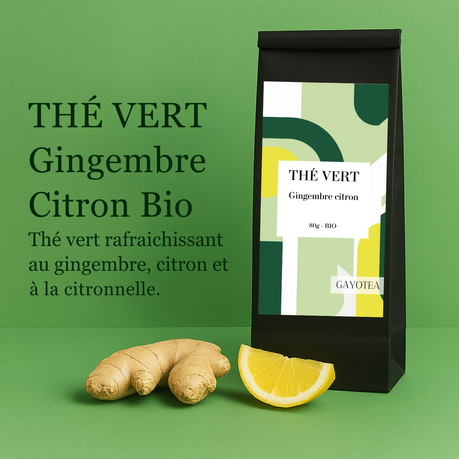 Au cœur de ce mélange se trouve une association exquise de thé vert, de gingembre et de citron bio, connus pour leurs vertus stimulantes et rafraîchissantes, complétée par une touche de citronnelle bio :
